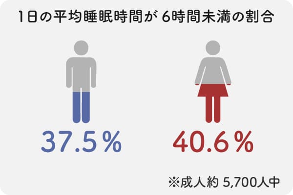成人の理想的な睡眠時間は6時間以上とされますが、6時間未満しか眠れていない人は、男性で37.5%、女性で40.6%にのぼります。