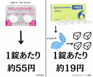 | 飲み方 | むくみ改善目的の場合:1日25〜100mgを1〜2回に分けて服用。 女性の薄毛治療の場合:1日25mg~100mgを服用。 |