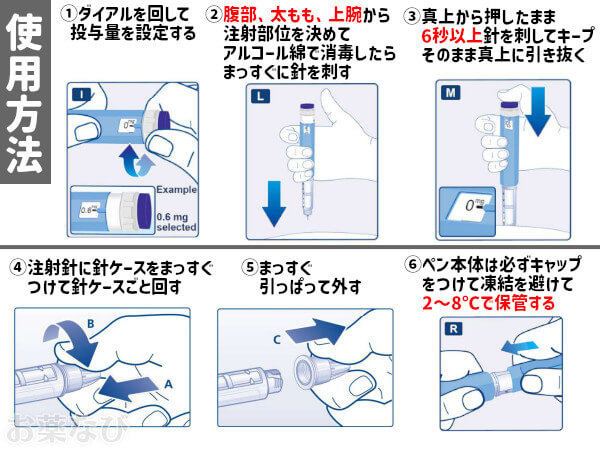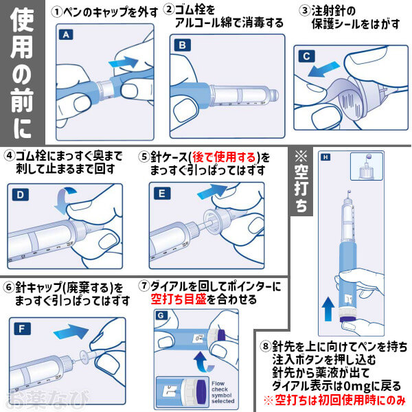 | 用量 | 1週目:0.6mg 2週目:1.2mg 3週目:1.8mg 4週目:2.4mg 5週目以降:3.0mg ※ペンのメモリをセットして調整可能 |