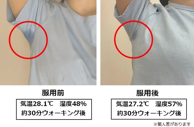 プロスパス服用後、約30分のウォーキング後の汗の量は、服用前と服用後では以下のような結果となりました。