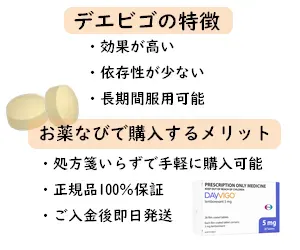 市販薬では眠れないので、思い切って睡眠薬買ってみました。デエビゴは依存性が少ないと聞いたので初挑戦です。思ったよりもよく効いてくれて久しぶりにぐっすり眠れて疲れが取れて助かりました。しばらくお世話になります。