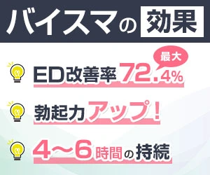 バイアグラの新しいジェネリックが出たと聞いてお試しで購入してみました。バイアグラのジェネリックは、カマグラやアグラゴールドなど何種類か試した事があり、今はカマグラを常用しています。今回バイスマを飲んだ感想としては、今まで一番シックリくる作用だなと感じました。副作用ももちろんありますが、効果が出始めるまでの機序だったり、効果持続時間や勃起力など、総体的に私の体に合っていると思います。パッケージもシンプルだし、この低価格でバイアグラと同じ効果を得られるのは何よりも魅力です。今後はバイスマを常用したいと思います。